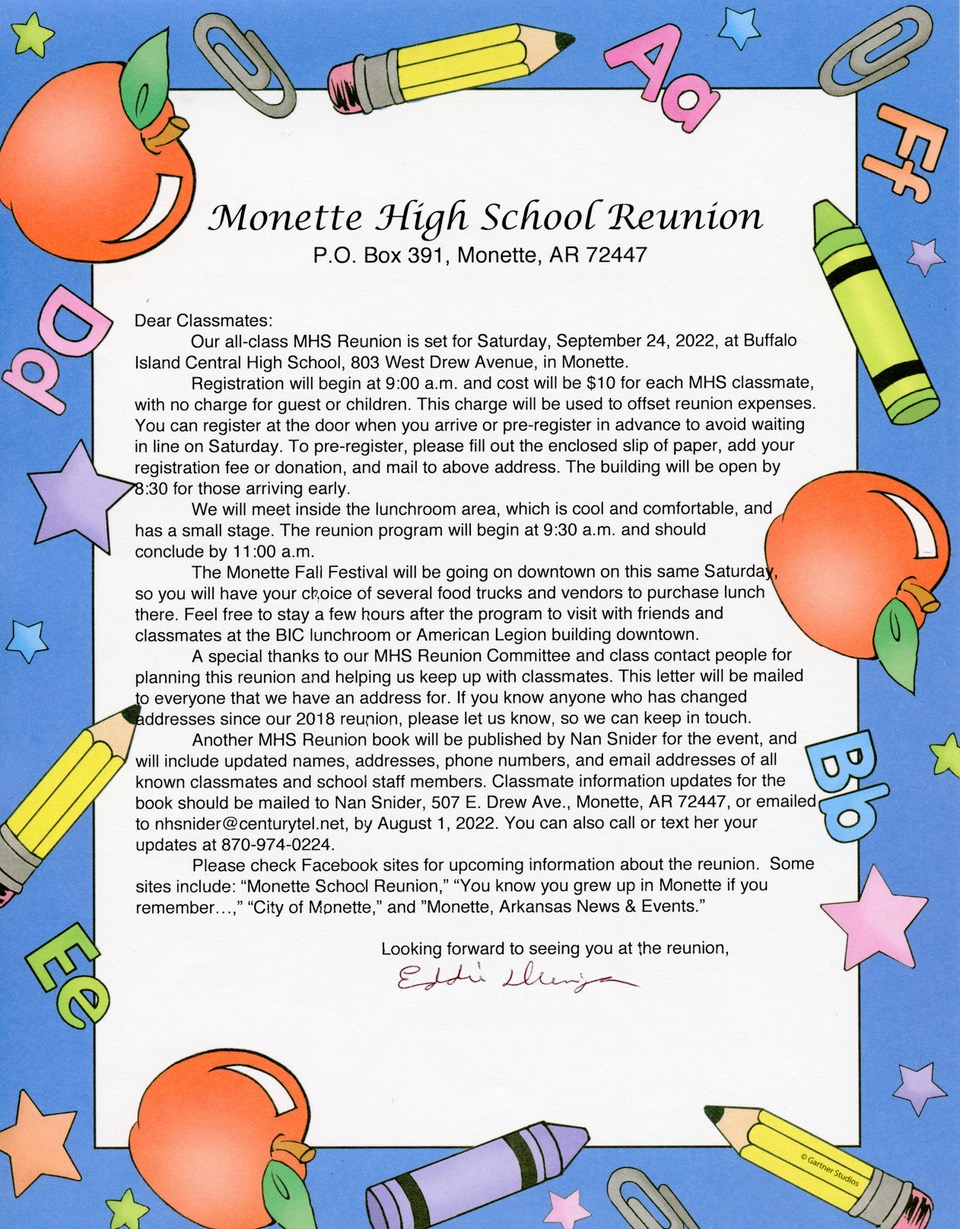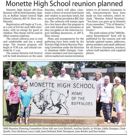 A MHS yearbook has been published by Nan Snider for the last reunion and includes names, addresses, phone numbers and email addresses of all known classmates and school staff members. For ordering info contact Nan Snider, 20212 Hwy 18E, Monette, Ar 72447, or email to nhsnider@centurytel.net